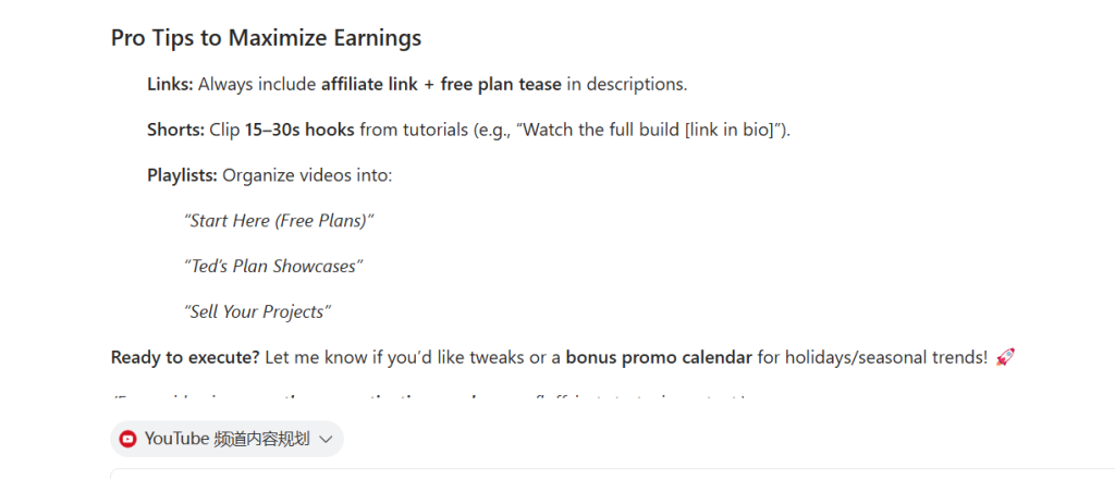 假设你的频道推广的产品是:clickbank联盟上的木工图纸 teds woodworking plans。这个智能体能为你马上提供30天的内容规划,结合了木工技巧贴士,产品review等,并分配了不同的比例,让频道不仅仅是推广视频,可以吸引潜在用户,又能实现变现。